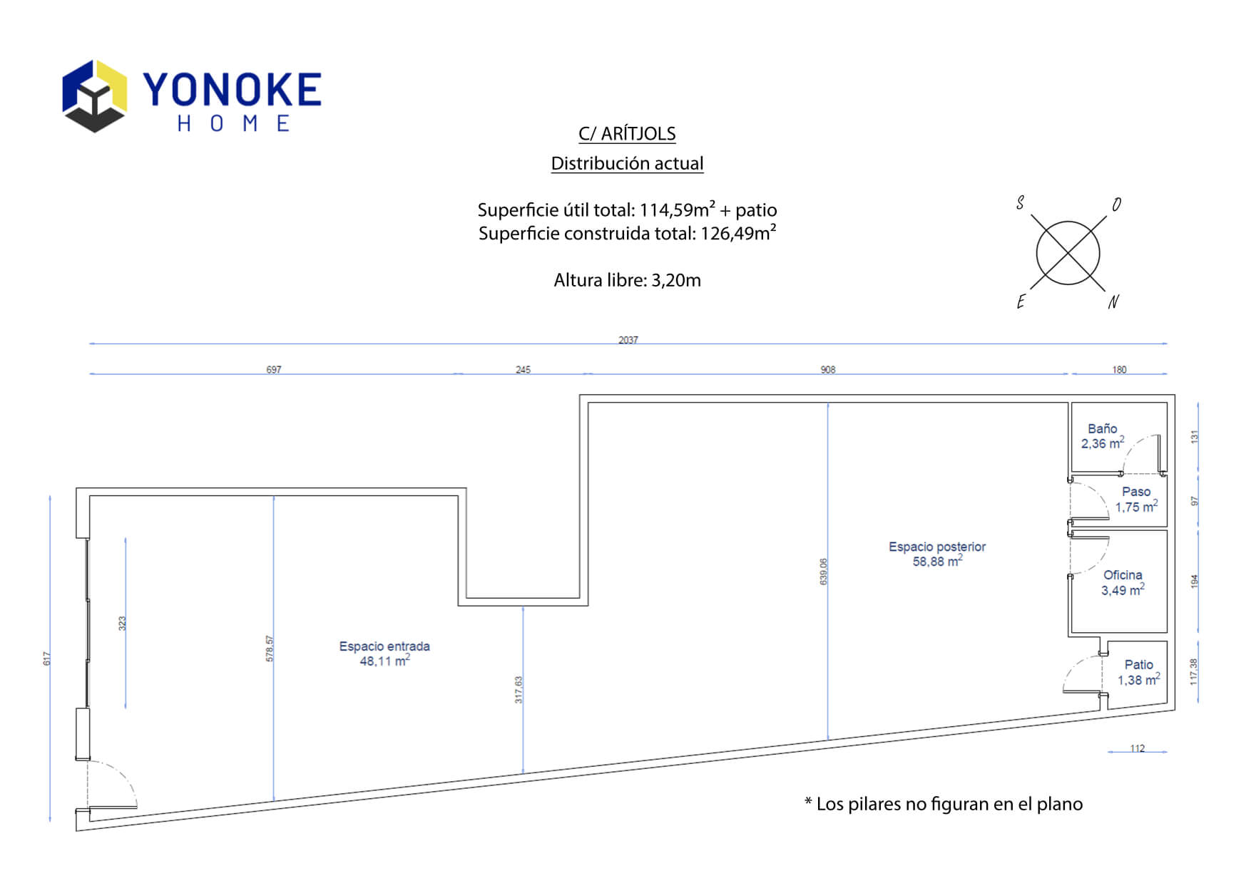 Inmueble con superficie útil de 115m² según medición (126m² construidos), distribuido en un gran espacio diáfano, más un aseo, un despacho y un pequeño patio en el fondo del local.