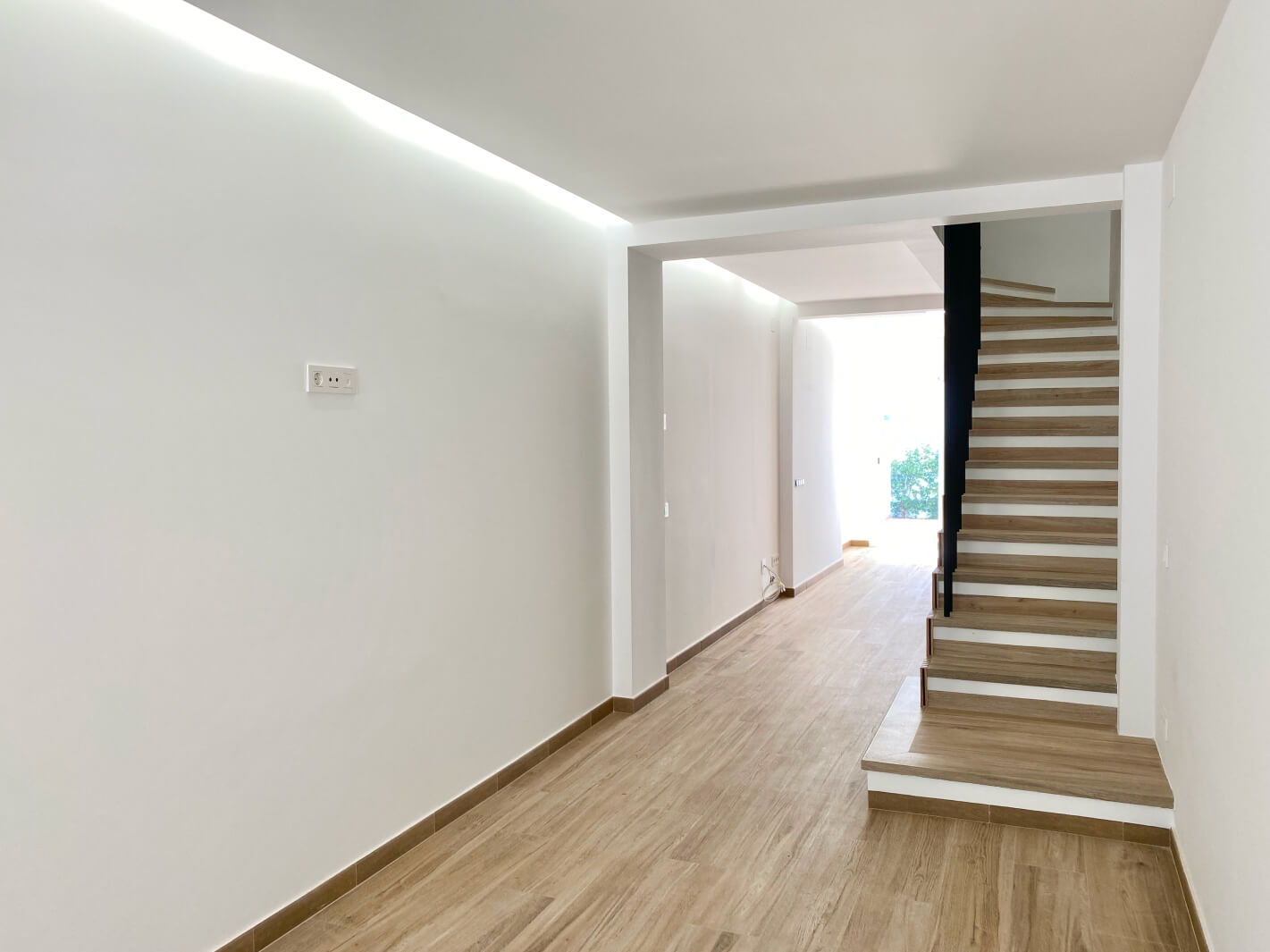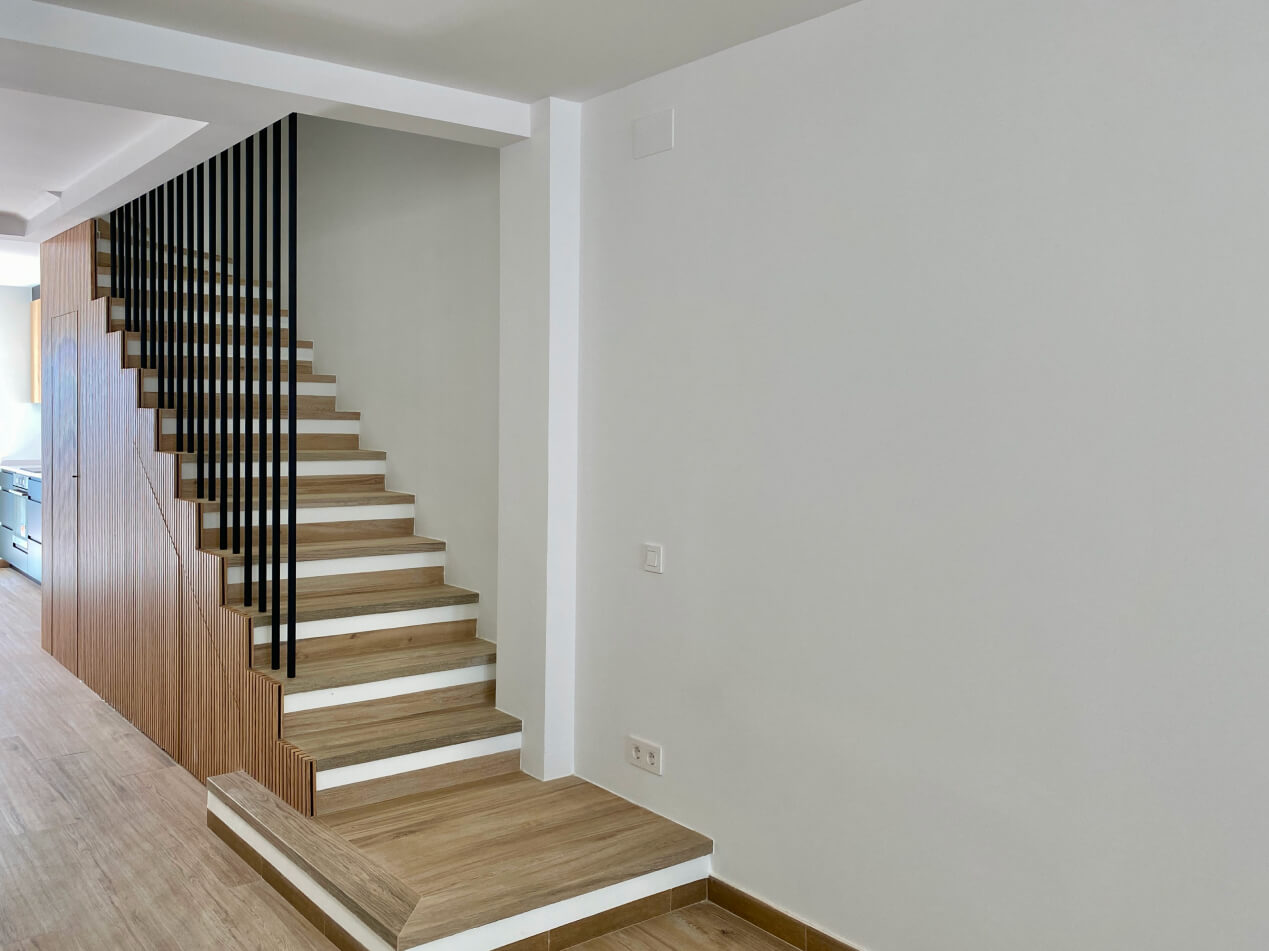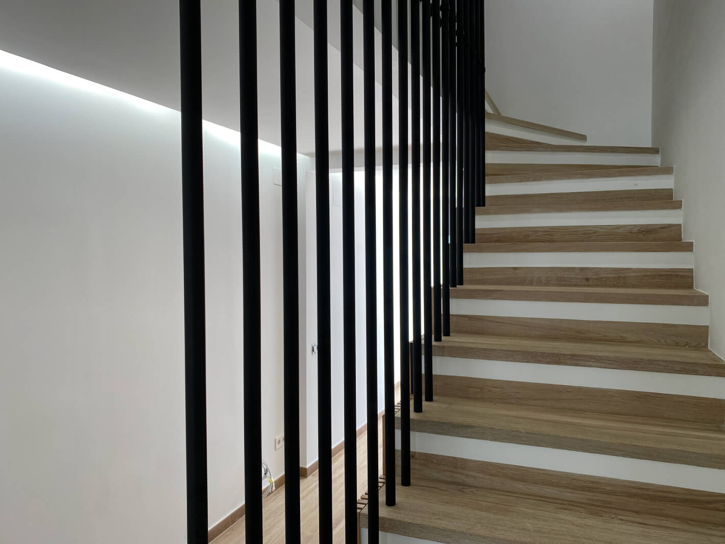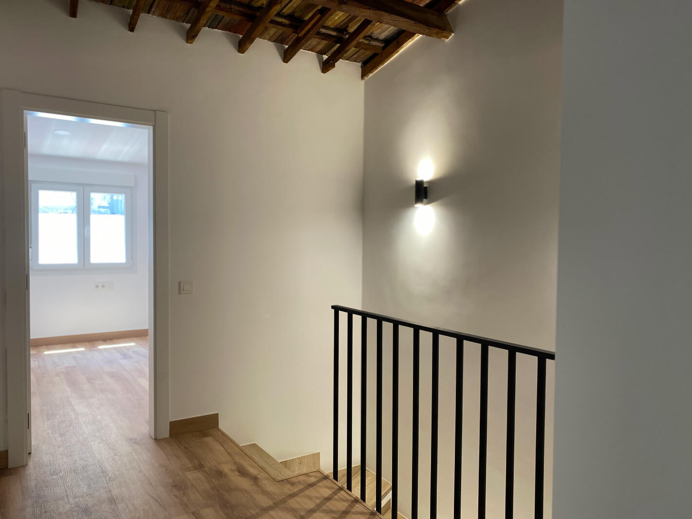 Zona de noche en planta primera: Dos dormitorios dobles exteriores (uno de ellos con salida a balcón), baño completo y una zona central de distribución que conecta mediante la escalera con la planta baja.